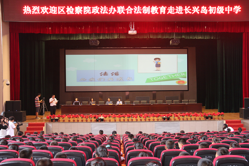 未检组检察官助理王惠,以“校园暴力那些事儿”为题,为长兴岛中学的近700名初一新生讲授了生动有趣的法治第一课。王惠通过文字讲解、图片介绍、观看视频动画短片以及与同学们的互动游戏等形式,向同学们讲述校园暴力的类型、产生的原因和应对暴力的方法,通过详细的案例让同学们切实认识到校园暴力的严重后果,引以为戒。在与学生们的交流沟通中,逐步引导学生们遵法守法的同时,也懂得如何用法律的武器保护自己。