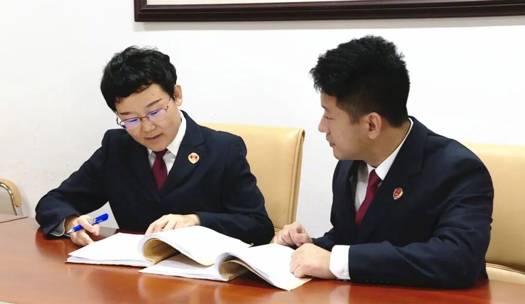 今年1月,办案检察官孙娟(左)与检察官助理对案件开展审查。