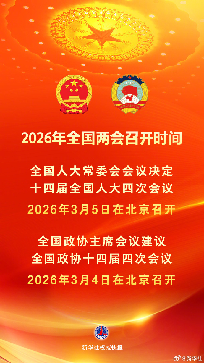 【#2026全国两会召开时间#来了】全国人大常委会会议12月27日表决通过了关于召开十四届全国人大四次会议的决定。根据决定,十四届全国人大四次会议于2026年3月5日在北京召开。政协第十四届全国委员会日前召开主席会议,建议全国政协十四届四次会议于2026年3月4日在北京召开。